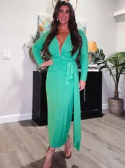 Inspire envy in this green Solace London cocktail dress with plunging neckline and waist snatching ruching.