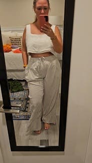 Really nice quality pants but size down! I’m an 8 and the 3 swallows me. The legs are very wide and long. I can’t wear them unfortunately.