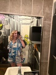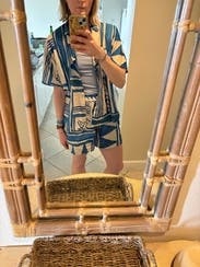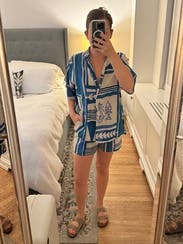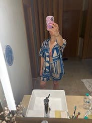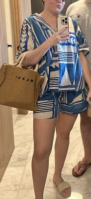 Rented as a set, wish I sized up! Don’t listen to people saying they run big. I think this look is better oversized, wish I would have rented a bigger size. Love the fabric and pattern (hello euro summer) got so many compliments. more photo & video reviews @whimzylindzy