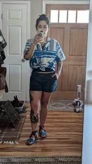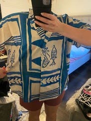 Rad shirt, loved the pattern. Wore it so much on my vacation, oversized fit so I sized down and it was still pretty big but I liked it. Beautiful color. Even dressed it up to wear dancing.