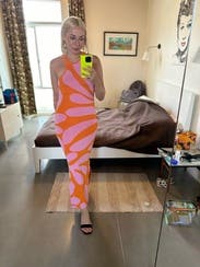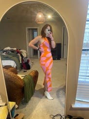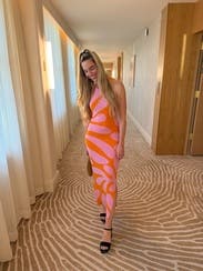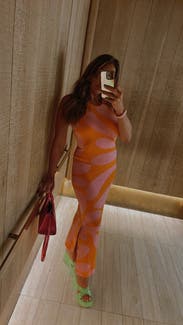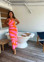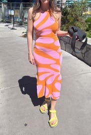 Orange printed knit (75% Rayon, 25% Nylon). Sweater sheath. Sleeveless. Halter neck. Pull on. 55" from shoulder to hemline. Imported.