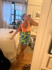 wanted to wear this for a trip to miami but never ended up wearing. just felt too goofy (another comment said spongebob vibes and i couldn’t shake it). top is a little big / loose but then also quite small so just felt a bit saggy. overall i wanted to love but couldn’t