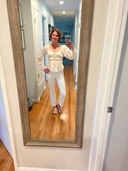 This is such a sweet feminine top. Love the fabric too. Wore with jeans.