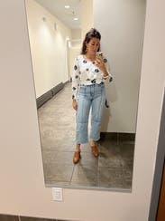 Very cute shirt, wore for birthday dinner and it is flattering- I love a summery sleeved crop top. It was slightly tight on chest so next time I'd order up a size. Also note it's pretty short so you wouldn't be able to wear it to work unless you had super high waisted pants!