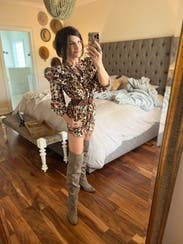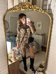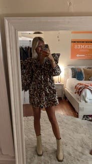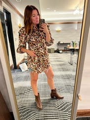 This is a super fun fall dress. I wore it out to dinners, concerts, and even Thanksgiving dinner with boots and booties. You could dress it down with nice sneakers, too. I wore this a ton! It is a little short, so it was fine for my petite self.