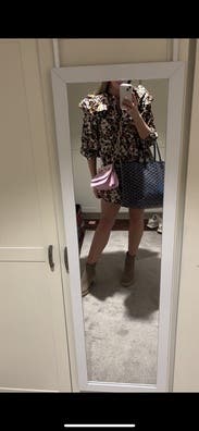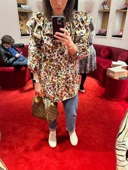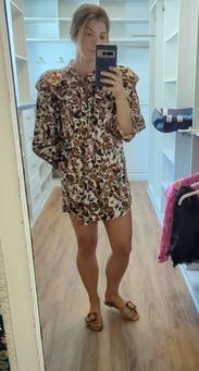 I rented the blouse version of this piece and received so many compliments so I was really excited to rent the dress when it became available. Cons are it is very much a “shirt dress” so much so that my husband asked if I was planning to put on pants! I would say belt it to help give it more shape however, since it runs short, belting it made it a little to short on me. So what I would suggest is size up one size so you can belt it or just rent your TTS and be prepared to look like you’re just in a big shirt! ;)