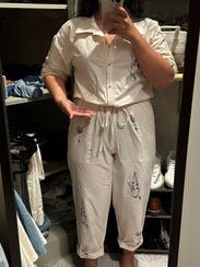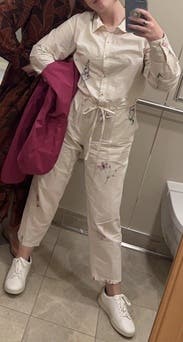 I got these cause it’s been really hot in Texas lately and I thought it would be cute for brunch or even a casual day at the office. I thought the hard part would be the leg length (of which I would just roll up) but it ended up being my torso. I couldn’t figure out a way to tuck in the extra fabric without going out and buyer a huge belt (which could work if you have one!) Other than that - the material is REALLY THIN - and a bit see through even with a nude bralette underneath. It’s giving top sheet ~ light pajamas I think this would be cute as more of a cover up for a beach day or in a space where you could get away with everything unbuttoned so the baggy look is intentional. Or if you’re a vertically gifted queen ❤️