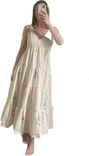 Off white floral cotton blend (98% Cotton, 2% Spandex). Maxi. Sleeveless. V-neck. Pull on. 48" from shoulder to hemline. Imported.