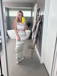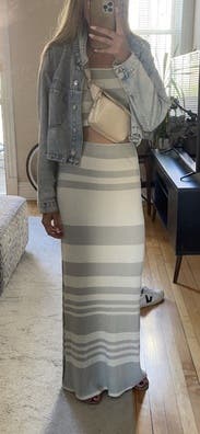 Rented the set and got lots of compliments. The skirt is LONG…..was hoping to just wear with sandals but it did drag on the floor. It is a sweater material and skims/hugs the body which can be flattering and unflattering depending on angles. Felt like it don’t make my backside look good… :(