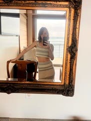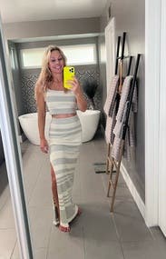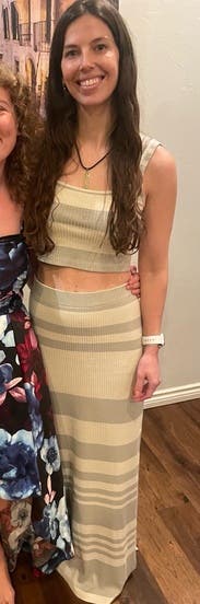Rented the set for vacay and will say I like the top better than the skirt and a solid four as a stand alone. As a set it’s a 5….even though the skirt is a 3 by itself. Top has a square neckline that is I cleavage enhancing while not being fo fitting. Weird but give me a like when you rent and experience!!