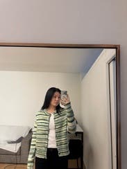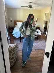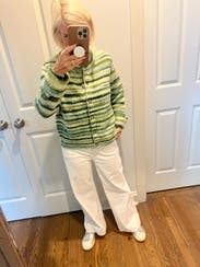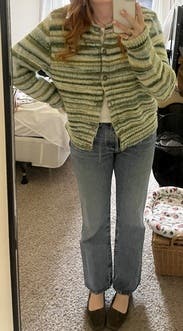 Fun green sweater for spring, warm and fits great. Arms are a little long but can easily be rolled up