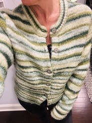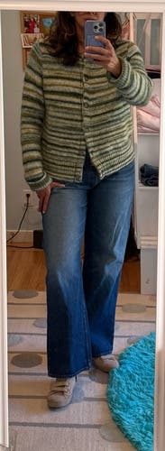 I wore this sweater several time, mostly as a buttoned up style. It was unbelievably warm, usually wore just tank, which also shows that it isn’t itchy at all. I did cuff the sleeves, and still was perfect length on me. I doubt I would give it a second look in the store, but was really surprised how much I liked. Also loved the colors.