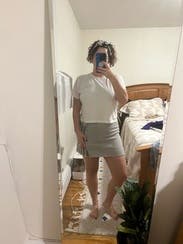 Such a cute skirt! Runs a little small, so maybe if I ordered a size up the slit would not have been a problem. It was fine while standing up, but when I sat down it went WAY too high.