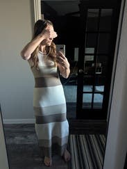 The dress fits amazing and is super soft. It’s thin material, but not in a cheap way. It’s not see through and hangs really well without feeling like a bag, but also not body con.