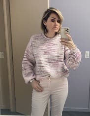 I loved this so much I was very tempted to buy it. Very petty colors, not itchy, great fit. Sleeves were a tad long, but I’m a shortie. Not to thick for a bit of a front tuck to add shape.
