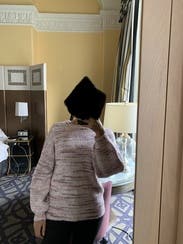 Beautiful lavender color. Cozy and warm, while still looking put together. I loved wearing this with jeans.