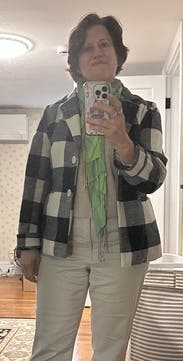 I wore this for cool fall days throwing it on for errands and neighborhood walks. Fit was ok despite fabric being stiff. Unlined which contributed to the awkward feel.
