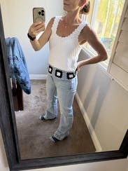 Loved this comfy top and got lots of compliments. The crochet is so cute. It does hang a little low at the chest.