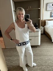 I love this sweater tank. I wear it with jeans and a cropped denim jacket. My turquoise jewelry goes with the tank’s patterned bottom.