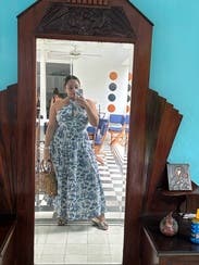 Blue printed cotton blend (98% Cotton, 2% Spandex). Top. Sleeveless. Halter neck. Pull on. 16.5" from shoulder to hemline. Imported.