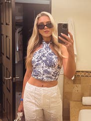 Style this beach print halter top by STAUD with the matching skirt to create the ultimate vacation outfit.