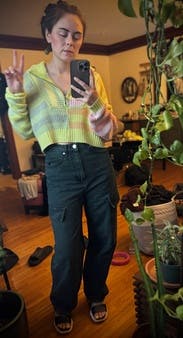 Love this and wish I kept it longer. It’s a great transitional piece, not too warm and bright spring colors. It is very cropped to the point if I raised my arms it was up to my bra so definitely needed high waist jeans and a tank underneath