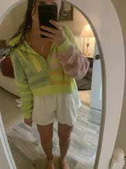 THE COLORS ARE AMAZING. I purchased both the neon and blue version of this sweater. My go-to that I grab for a breezy beach day. follow for more photos & reviews @whimzylindzy