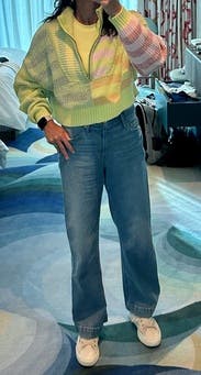 One of my favorite rentals! It’s definitely cropped, and I have a short torso to begin with. But the colors and patterns are just so fun. It’s not the softest sweater but still very comfy. Wore it multiple times. Seriously considering buying it!