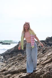 The weight of the sweater is just about perfect for late winter/early spring, when it is still chilly but not cold enough for a heavy wool knit. You won’t overheat in this one. For me it might be a little too lightweight for truly cold temperatures. I rented this in a small and it was the perfect length for me, it hit right at the top of my high waisted jeans. For reference , I am 5’2”/125 lbs. I actually rented the identical sweater in the blue color way but in an XS; I didn’t like the fit of the XS on me at all… the XS was too short. So maybe don’t size down on this one !