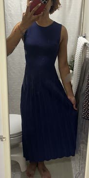 This dress is lovely. Gorgeous blue — not quite navy but not quite royal. Heavy quality material that holds you in well. Perfect length and hangs so well. Loved wearing it.
