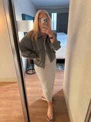 This ran huge, so I’m glad I got the smallest size! I wore this so many times during my vacation. It was a classic look that elevated my sweats at the airport. Definitely a light jacket though so not super warm.