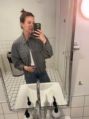 This is the perfect lightweight jacket for the changing seasons. It already comes oversized, so no need to size up. It's a great extra layer for those days when the weather is unpredictable. I'll be wearing this all through early fall!
