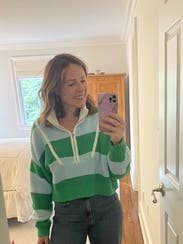 Green striped knit (60% Cotton, 40% Acrylic). Sweater. Long sleeves. Quarter zip. Front zipper closure. 18.5" from shoulder to hemline. Imported.