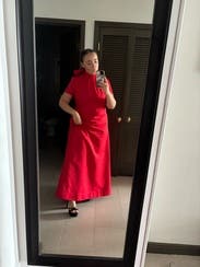 This was my backup dress but I liked it better than my first choice. It is so comfortable and adorable. The big bow on the back is a delightful contrast to the minimal front. I am 5’7” and 135 pounds and small fit well, though another inch in length would have been prettier. Also, it has pockets. It’s red! It’s a little edgy and that suited me just right. I wore it with all black accessories. I felt great.