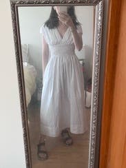 I did not end up having an opportunity to wear this, but I will definitely rent it in the future for vacation because it is so cute! Extremely flattering and comfortable and just overall really great classic white vacation dress! TTS and not overly cleavage which I was worried about