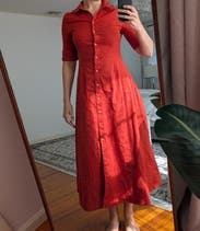 Red cotton (98% Cotton, 2% Spandex). Casual dress. Short sleeves. Collared neckline. Front button closure. 45.5" from shoulder to hemline. Imported.