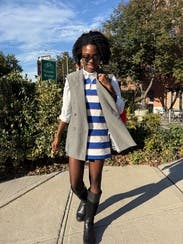 The STAUD Julius Mini Dress serves up bold stripes and a crisp collar for a sporty, standout vibe. Pair it with white sneakers and a structured mini bag for a sharp daytime look.