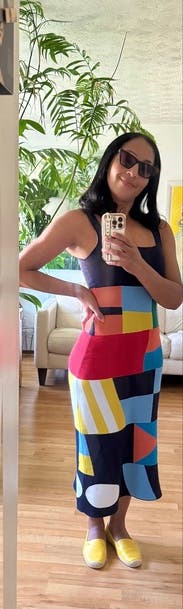 I love the bold color blocking of this dress and ordered it during June for Pride month, but kept it an extra cycle to figure out how I could actually wear it. The middle is tight like other reviews have said and it hugged my curves well. But the straps are long and to avoid them falling off my shoulders or showing my strapless bra, I wore a white sports bra under and that worked. Fabric is thick for summertime. I paired it with a navy blazer for work and got lots of compliments.