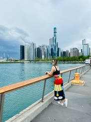• The dress is a modern, artistic statement piece with its bold color-block design. The mix of black, red, yellow, white, and blue creates a striking, almost geometric look — it feels very contemporary and playful. • The fitted black top balances the bold patterned skirt, making the silhouette flattering without overwhelming the frame. • The maxi length adds elegance, while the sleeveless cut keeps it breezy and casual.