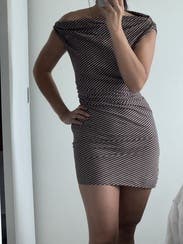 Great dress. Material is light and has enough stretch that sizing isn’t tricky. It is super short. Hard to tell but the stripes are chocolate brown and ivory.