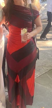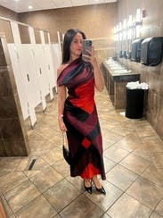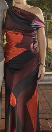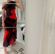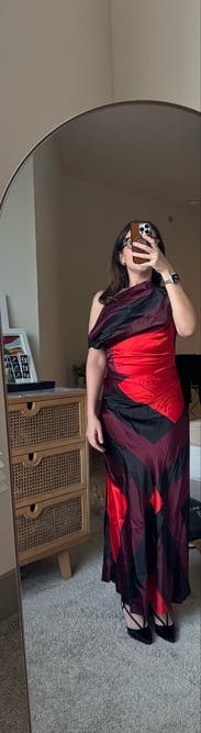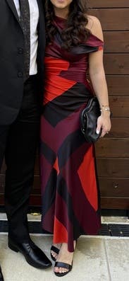 Wore this for my brothers rehearsal dinner. SUCH a gorgeous dress and so well made, the silk was so soft and the fit was beautiful. Such a comfortable material and easy to wear all night. The only thing I will note is that this dress had no give and did run a bit narrow through the waist so it may be slightly smaller than true to size.