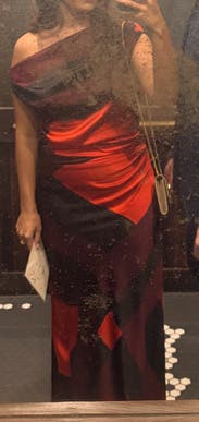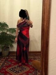 Wore for movie premiere. Clings to curves, beautiful drape at shoulders, front gathers hide a bit of a belly. Can wear your own strapless bra. The color is as shown in the online photo. Hit at the ankle (I am 5'5") Size worn L