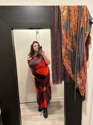 Rented both the 8 & the 10; the 10 was the fit at my current 155 lbs - especially with a Prix fixe dinner wine pairings…me clowning in the restaurant restroom since I could camo into all the colors :) Loved the dress for a fancier occasion as it is definitely Midi length.