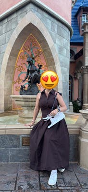 I love fall fashion and colors, but it’s still 80+ degrees in Florida. I loved how I could still feel like a fall fashionista without sweating to death. The fabric is light and airy, the middle panel snatches the waist, and it’s the perfect maxi length for petites. I paired it with smart sneakers and my Zero popcorn bucket as a purse and wore to Disney. I did not feel hot at all, and I stood out as one of the best dressed people there.