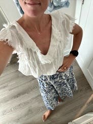 Wore this set for a Charleston weekend and loved it so much I bought it. Will be perfect for South of France this summer. Looks great with Orans or Dways. No need for a bra as the top is very supportive. The skirt does need a slip and fits snug at waist. Top is smocked at back so has an adjustable fit with no back fat issues.