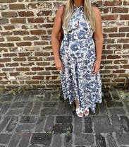 Blue printed cotton blend (98% Cotton, 2% Spandex). A-line. Side zipper closure. 37" from waist to hemline. Imported.
