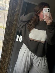 This sweater is amazing. So comfy and cute. medium was perfect middle ground of oversized and stylish. Not too big. Would rent again for sure