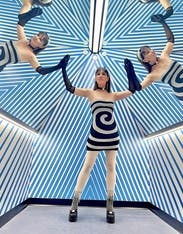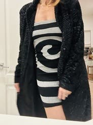 The swirl is a fun, eye-catching design and miraculously smooths out any imperfections. Perfect mini dress for a sexy party look. I styled it with tall black boots and fluffy fur jacket.