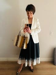 Staud does it again! A fantastic black dress that is still interesting with the white border. The material is on the more casual side, but it's structured enough that I didn't need a bra. You can dress it up a bit with a belt and accessories (like my picture), or dress down with sandals.