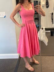Pink cotton blend (98% Cotton, 2% Spandex). Lining (100% Cotton). A-line. Sleeveless. Square neck. Back zipper closure. 49" from shoulder to hemline. Imported.